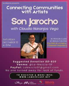 Join us on Saturday December 13 for a special Connecting Communities with Artists Son Jarocho workshop with Maestro Claudio Naranjos Vega and La Rama + Community Fandango in the neighborhood! RSVP required due to limited capacity!